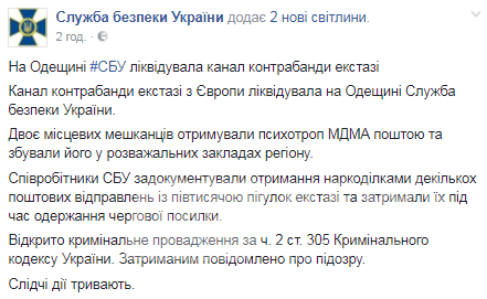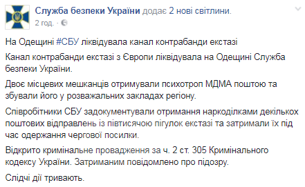 По данным источника, двое жителей Одесской области получали наркотическое вещество (МДМА) по почте и сбывали его в ближайших ночных клубах и других развлекательных заведениях.
