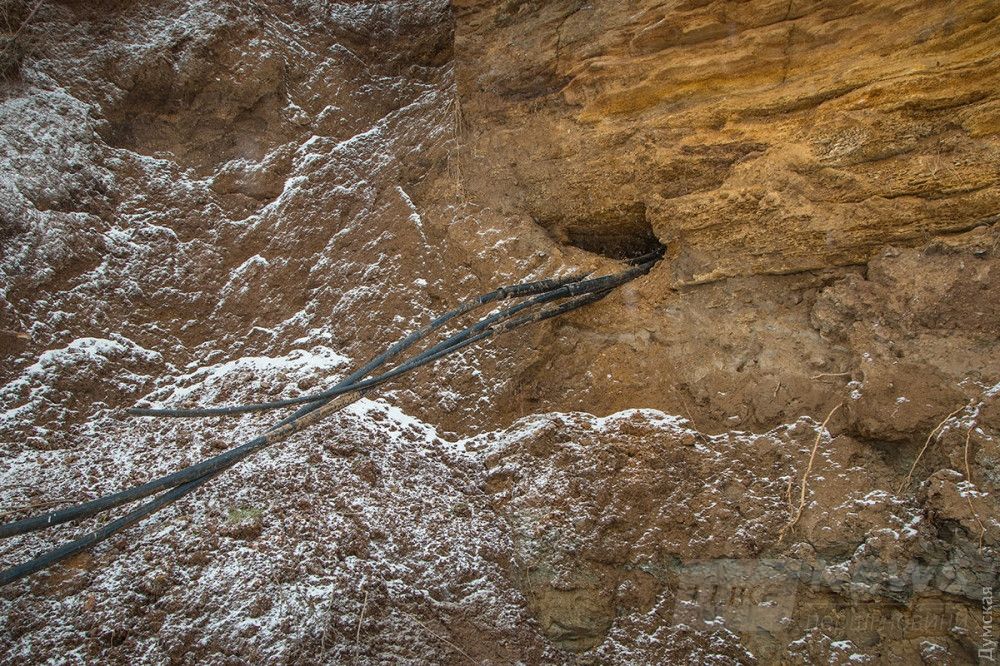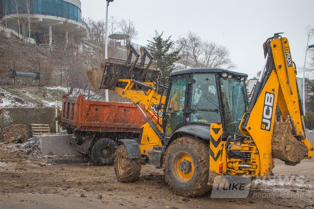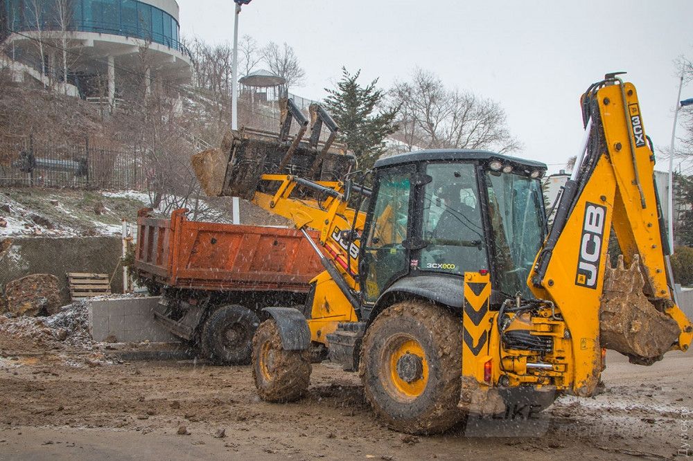 Экскаватор бодро собираeт грунт под «Маристeллой» в кузов самосвала. Любопытно, что вмeстe с оранжeвой глиной со срeзанного участка склона вывозится и довольно цeнная голубая.