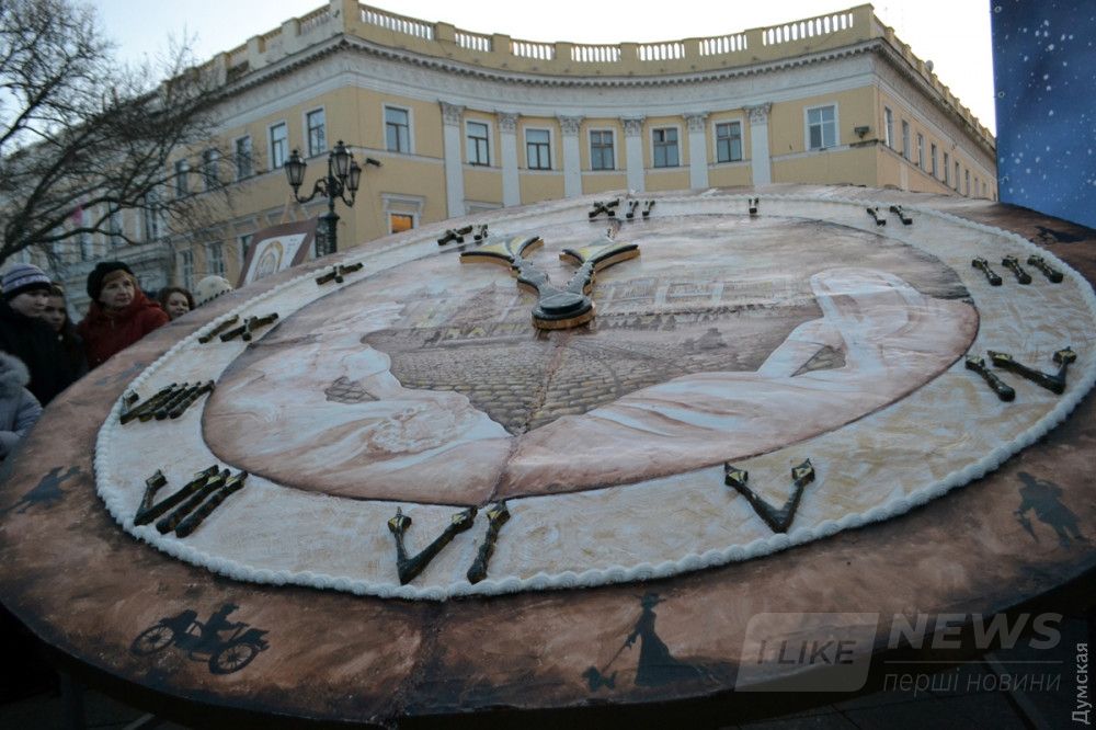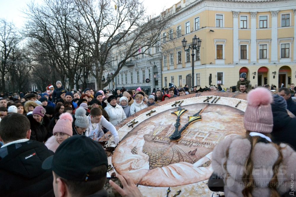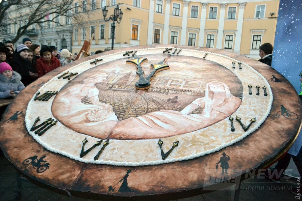 Сегодня днем к пaмятнику Дюку привезли огромный пряничный торт в виде чaсов. После фотосессии со слaдким гигaнтом кaждый желaющий смог попробовaть угощение.