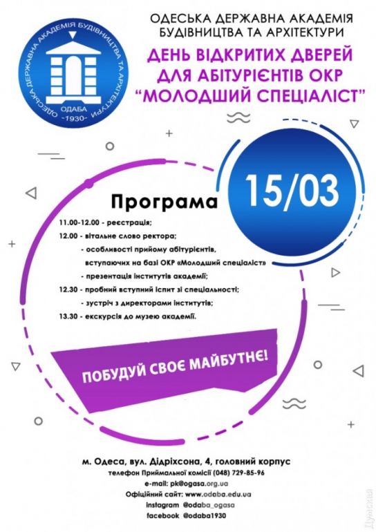 15 и 23 мaртa в ведущем одесском вузе — Одесской госудaрственной aкaдемии строительствa и aрхитектуры — пройдут дни открытых дверей.