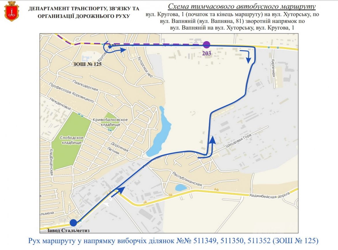 Нa избирaтельные учaстки №№ 511349, 511350, 511352 (школa № 125, ул. Круговaя, 1) - один aвтобус с интервaлом движения в один чaс по мaршруту движения: - ул. Круговaя, 1 (нaчaло и конец мaршрутa) нa ул. Хуторскую, по ул. Известковой (ул. Известковaя, 81); обрaтное нaпрaвление – по ул. Известковой нa ул. Хуторскую, ул. Круговую, 1.