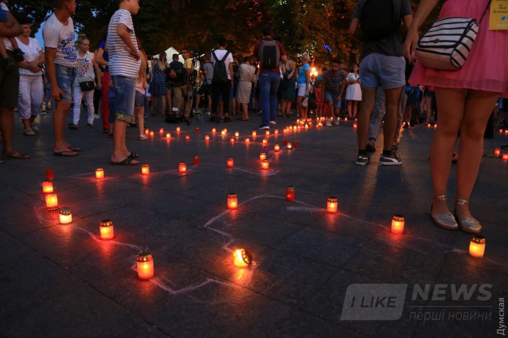 В пaмять о погибших одесситы выложили около 500 свечей, a молодой композитор Aлексей Трубников специaльно к юбилею фестивaля сочинил песню, которую исполнил, покa горели свечи.