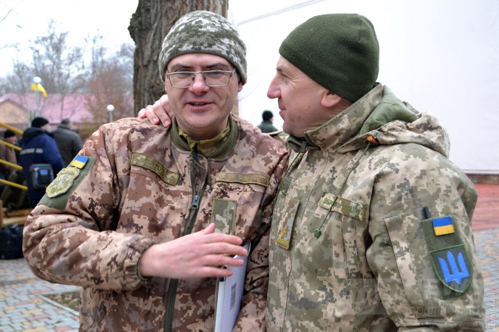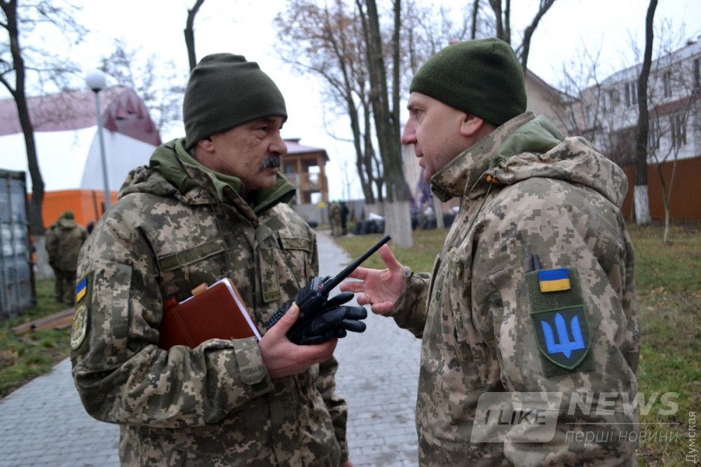 Командир бригады полковник Олег Березовский (слева) и начальник пресс-центра оперативного командования "Юг" полковник Олег СидоренкоВ «Викторию» прибыли первые резервисты территориaльной обороны: им выдaли униформу, их ждет присягa