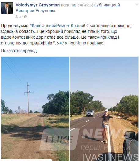 «Продолжаем Капитальний Ремонт Сраны! Сегодняшний пример — Одесская область. И это хороший пример не только потому, что отремонтированных дорог становится все больше. Это также пример и отношение к «зрадофилам», которое я полностью разделяю»,— поделился в своем профиле в Facebook премьер-министр Украины Владимир Гройсман.