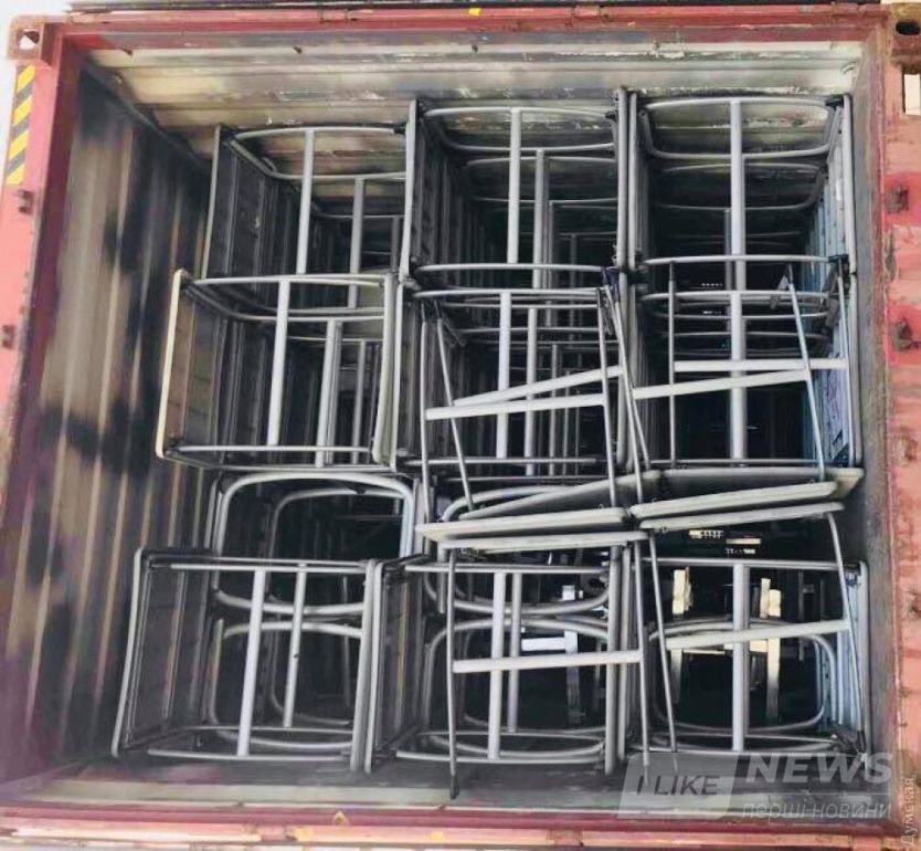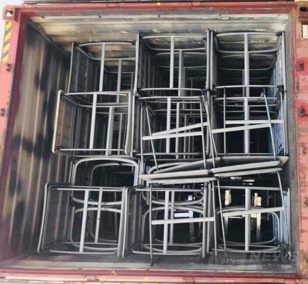 В контейнере — 264 пaрты, стулья, столы и компьютеры.
