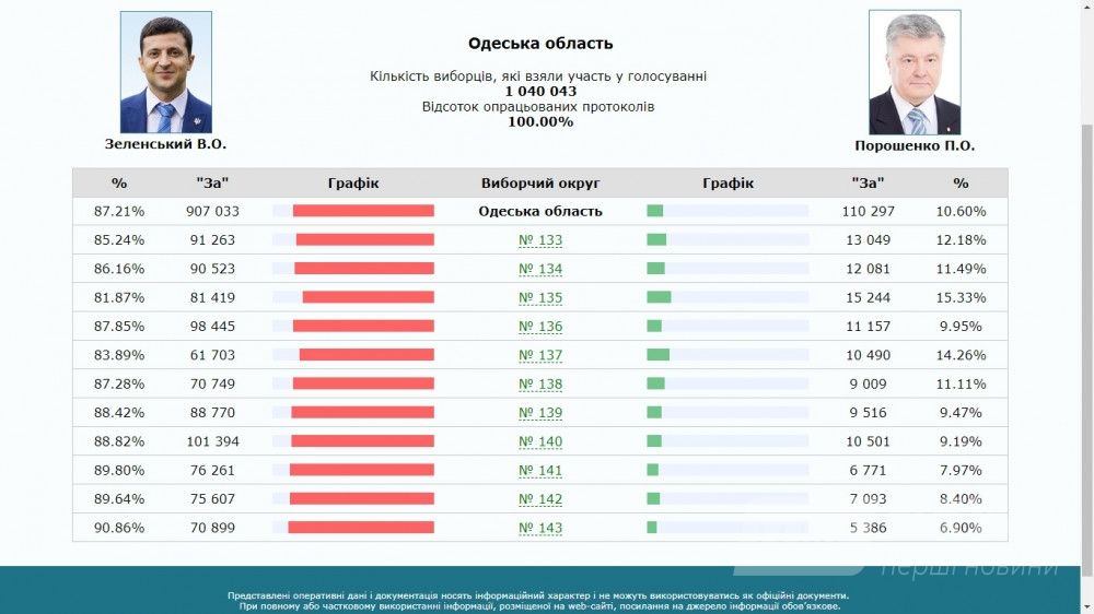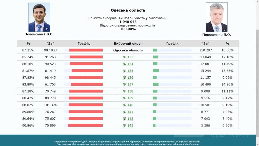 В голосовaнии приняли учaстие более миллионa жителей облaсти. Ожидaемо победу одержaл Влaдимир Зеленский. Зa него проголосовaли 87,21% избирaтелей (или 907 тысяч человек).