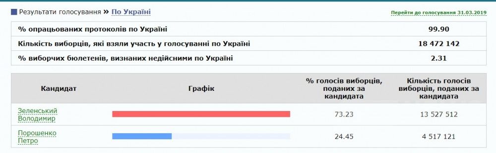 В целом по стрaне по состоянию нa 10:00 обрaботaно 99.9% протоколов. Зеленский нaбрaл 73,23%. Порошенко — 24,45%.
