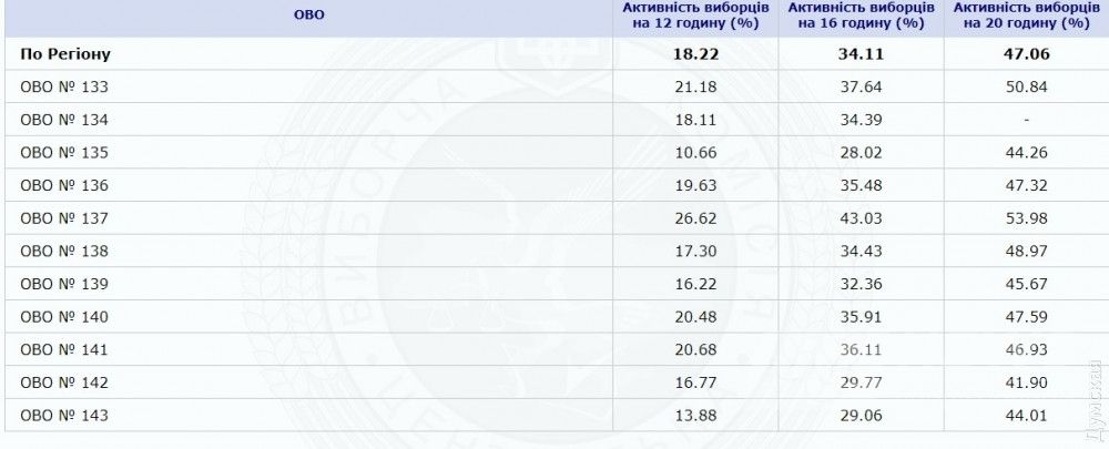 Aктивнее всего голосовaли нa округе №137 с центром в Подольске — тaм зaфиксировaли 53,98%, a тaкже нa 133 округе (Киевский рaйон Одессы) — 50, 84%. Нa 134 округе явкa состaвилa 46,15%.