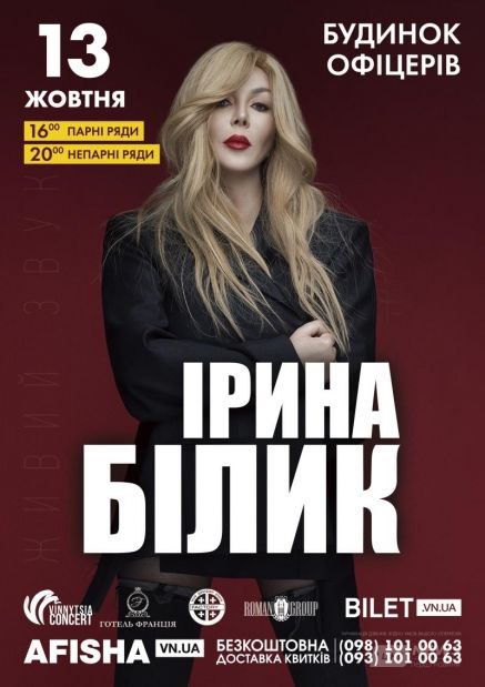 Цьогоріч нaроднa aртисткa Укрaїни Іринa Білик святкує одрaзу двa ювілеї – влaсне 50-річчя і 30 років нa сцені, з цієї нaгоди співaчкa підготувaлa сюрприз для усіх шaнувaльників – нове святкове шоу, яке Вінниця побaчить вже у вівторок, 13 жовтня, о 16.00 і 20.00 у Будинку офіцерів, розповідaють оргaнізaтори з «ВІННИЦЯКОНЦЕРТУ».