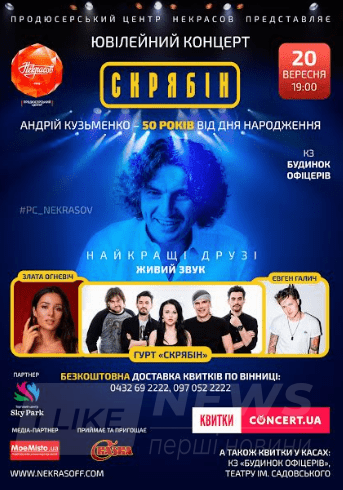Романтично продемонструвати силу своїх почуттів – не просте завдання. Та ми знаємо вихід! Даруйте коханій людині квитки на ювілейний концерт «Скрябін: Андрій Кузьменко – 50 років від дня народження», який відбудеться 20 вересня, о 19.00, у Вінницькому «Будинку Офіцерів». І вашу ніжність, щирість та турботу оцінять по-справжньому!