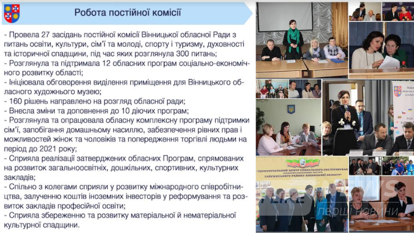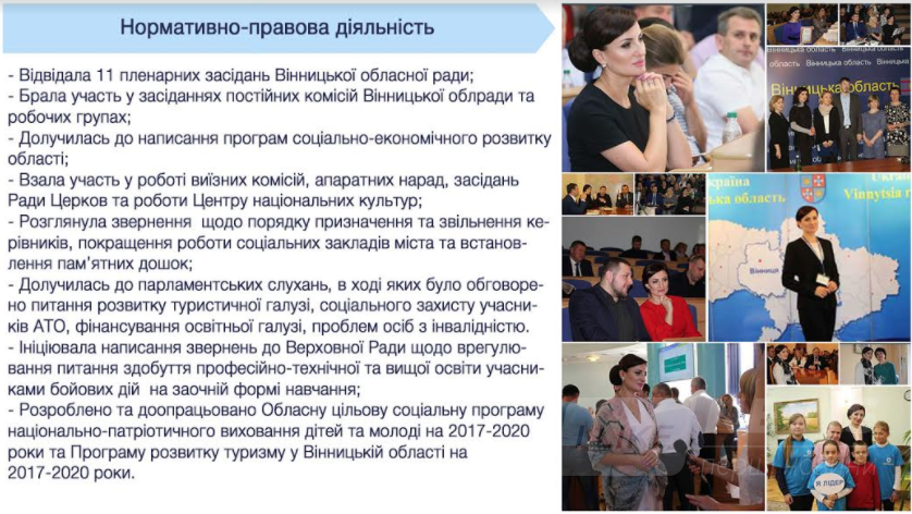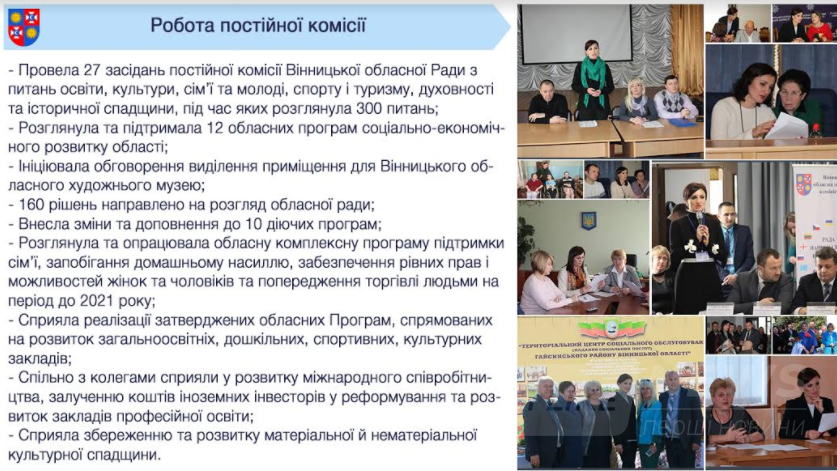 Перед початком нового пленарного року депутатка Вінницької обласної Ради, голова постійної комісії з питань освіти, культури, сім’ї та молоді, спорту і туризму, духовності та історичної спадщини та засновниця благодійного фонду, Людмила Станіславенко, розповіла про виконану роботу за 2017 рік.