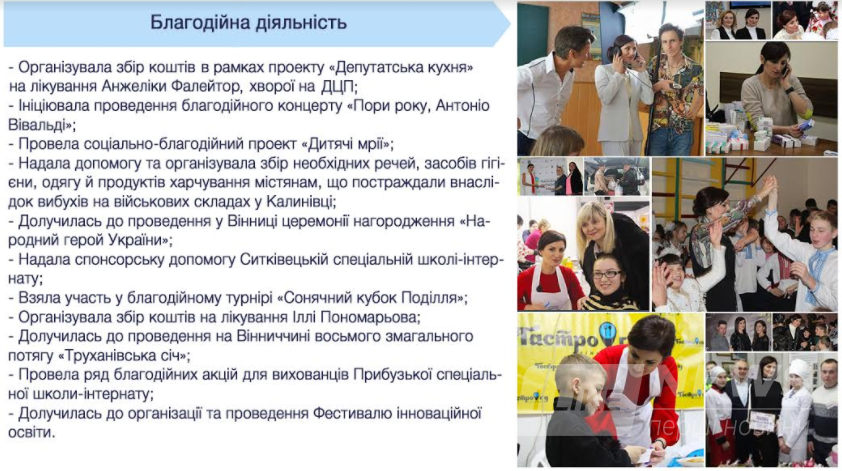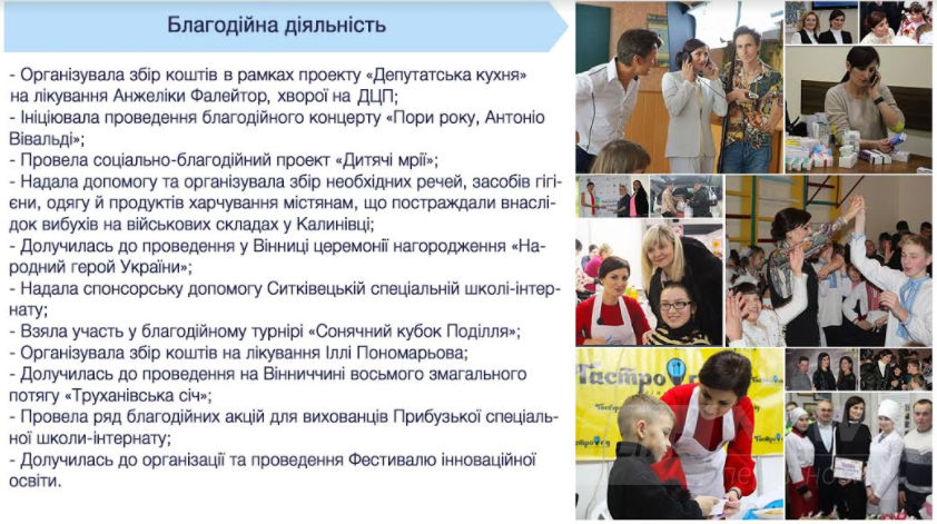 Також вона наголосила, що минулоріч за її ініціативи у місті пройшли десятки благодійних акцій на підтримку важкохворих дітей, бійців АТО та внутрішньо-переміщених осіб, виділялись кошти з депутатського фонду на лікування та інші потреби громадян, що звертались в депутатську приймальню.