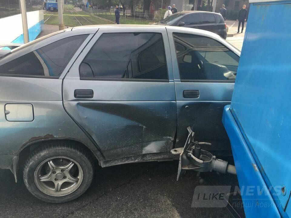 Близько 11:00 на перехресті вулиці Данила Галицького та Хмельницького шосе зіткнулися трамвай та автомобіль «Лада 12».