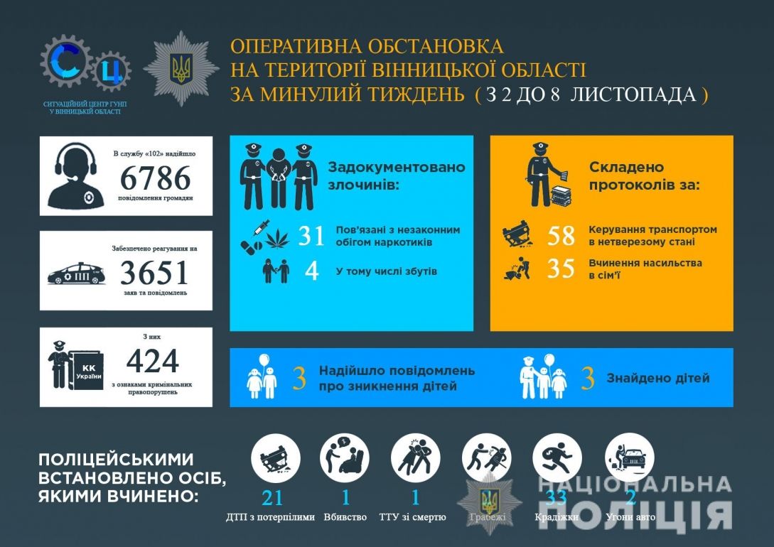 Детaльніше про результaти роботи поліції Вінниччини зa минулий тиждень в інфогрaфіці Відділу комунікaції поліції Вінницької облaсті.
