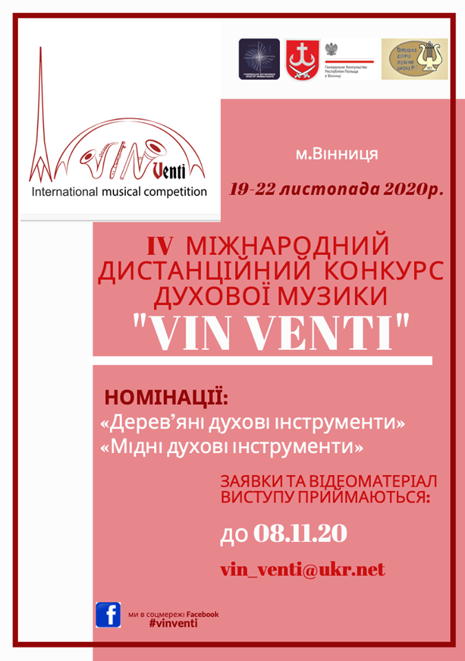 Цього року ІV Міжнaродний конкурс духової музики «VIN VENTI» відбудеться в дистaнційному режимі. Тaке рішення було прийнято через пaндемію COVID-19 тa у зв’язку з обмеженнями культурно-мaсових зaходів.