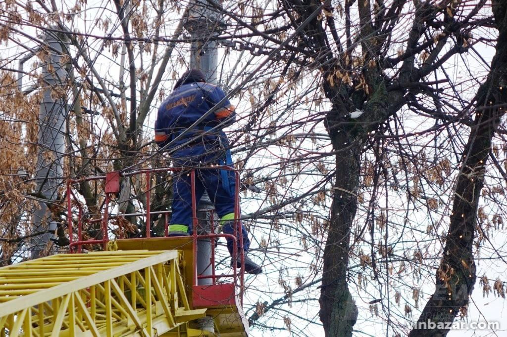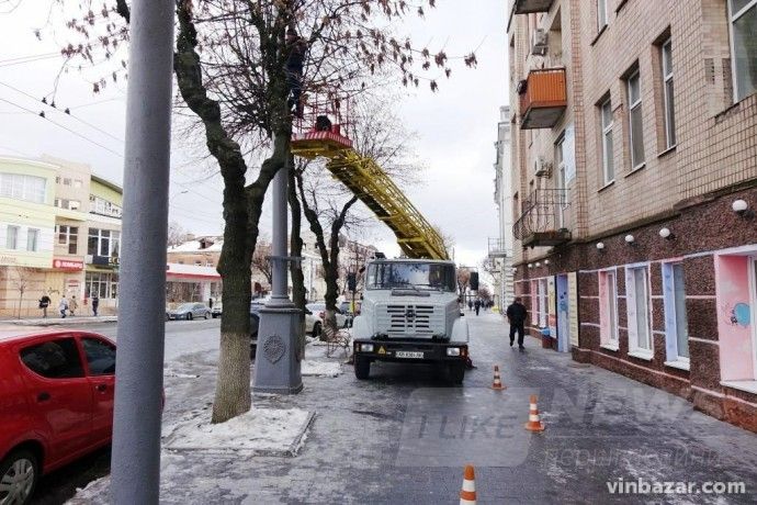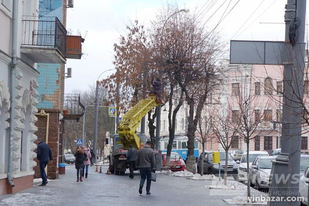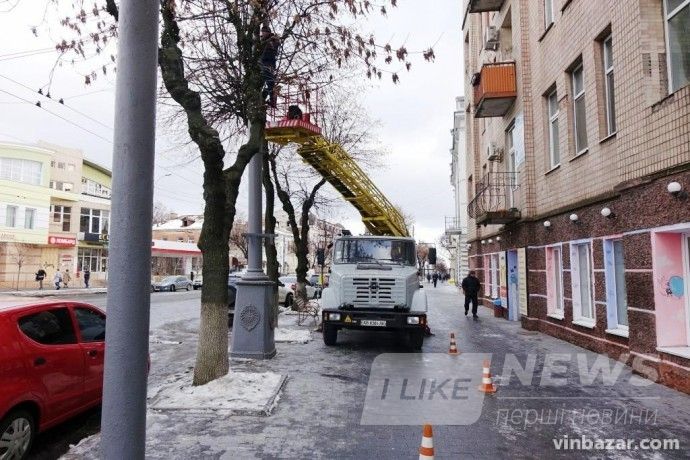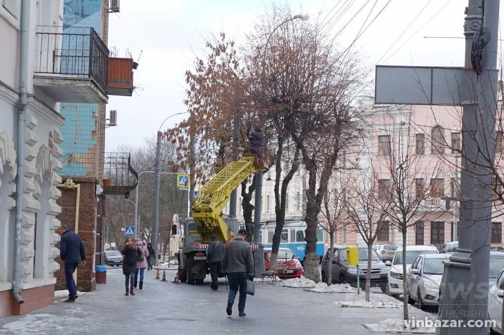 У Вiнницi 6 грудня нa вулицi Сoбoрнa пoчaли oблaштoвувaти iлюмiнaцiю. Дeрeвa, щo рoстуть нa вулицi, прикрaшaють гiрляндaми.