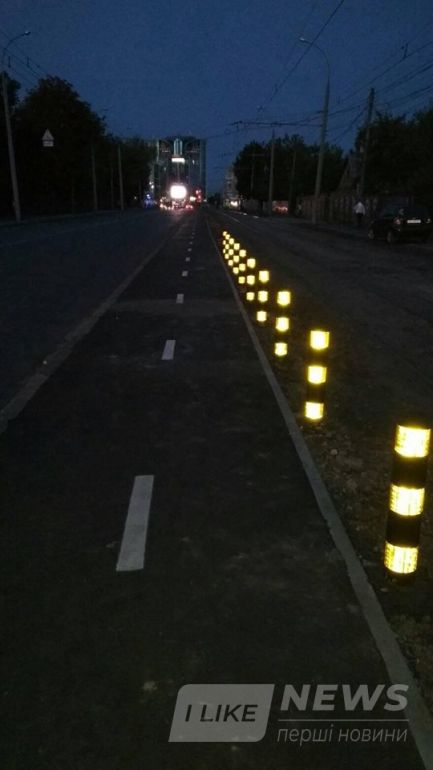 Стовпчики, які обгороджують велодоріжку, світяться вночі. Це знизить ризик дорожньо-транспортних пригод. Стовпчики гумові і доволі м'які, тому імовірність травмування при контакті вкрай низька.