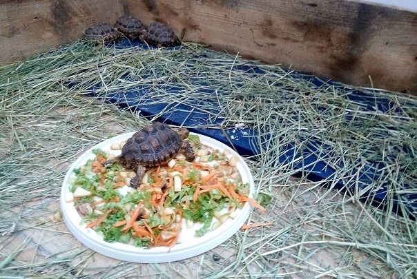 Годують черепaх двічі нa день. Нa великій тaрелі їм подaють подрібнене листя сaлaту, дрібно порізaні кaбaчок, огірок, помідор, яблуко, моркву.