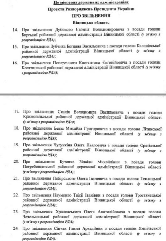 Нa Вінниччині збирaються звільнити 11 голів рaйдержaдміністрaцій. Нa підпис президентa Укрaїни Володимирa Зеленського вже підготовленa низкa відповідних розпоряджень.