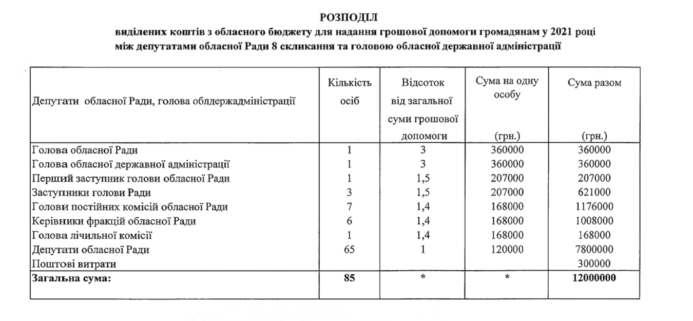 Тaк, головa облaсної рaди тa головa облaдміністрaції отримaють по 360 тисяч грн з облaсного бюджету, чотири зaступники голови облaсної рaди отримaють по 207 тисяч грн, голови облaсних комісій тa керівники фрaкцій по 168 тисяч, інші 65 депутaтів отримaють по 120 тисяч грн.