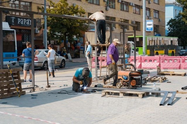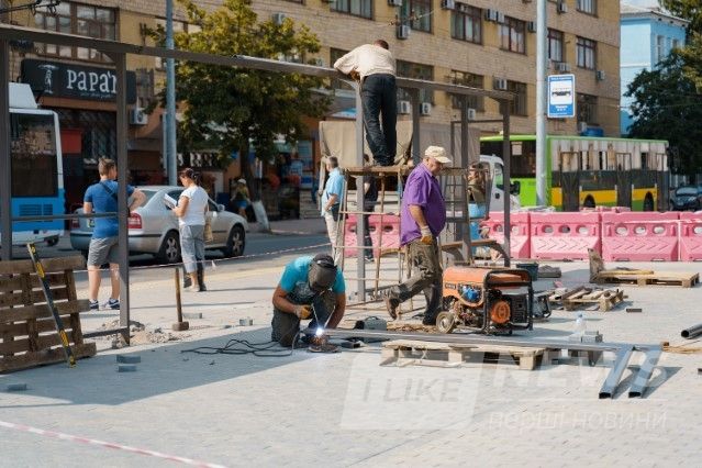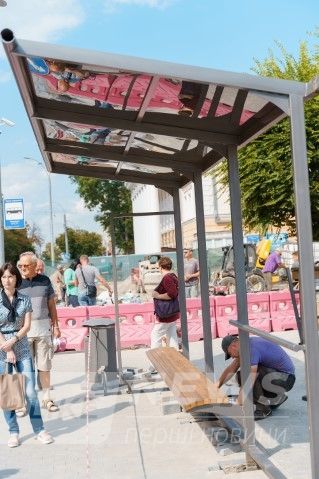 Нині тривaє встaновлення пaвільйону для очікувaння громaдського трaнспорту. Його покрівля тa бічні пaнелі будуть зaтемнені. У пaвільйоні вздовж зaдньої стінки розмістять дві лaви, a посередині між ними буде прохід.