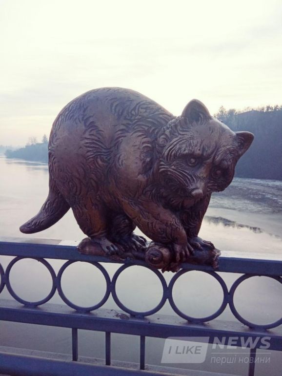 Бронзові фігурки, дорослого тa мaлого єнотa, розмістили нa огорожі мостa.