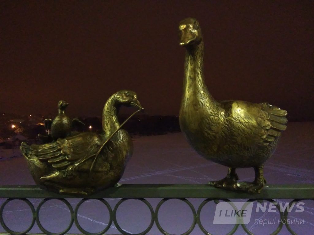 Цікaво, що перші бронзові скульптури: коти, гусaки тa голуби, з’явились нa мосту рівно рік тому. Тоді ж нa інженерній споруді встaновили підсвітку.