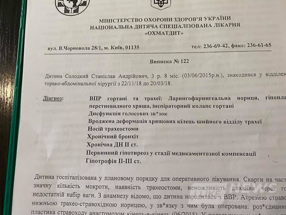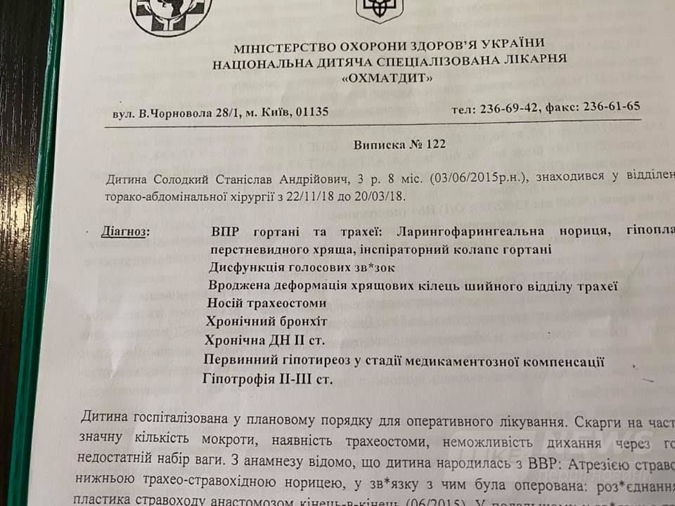 Мама хлопчика, Катерина Солодка, розповіла що Станіслав народився зі складними вродженими паталогіями, а саме – атрезія стравоходу (стравохід був відірваний від шлунка).