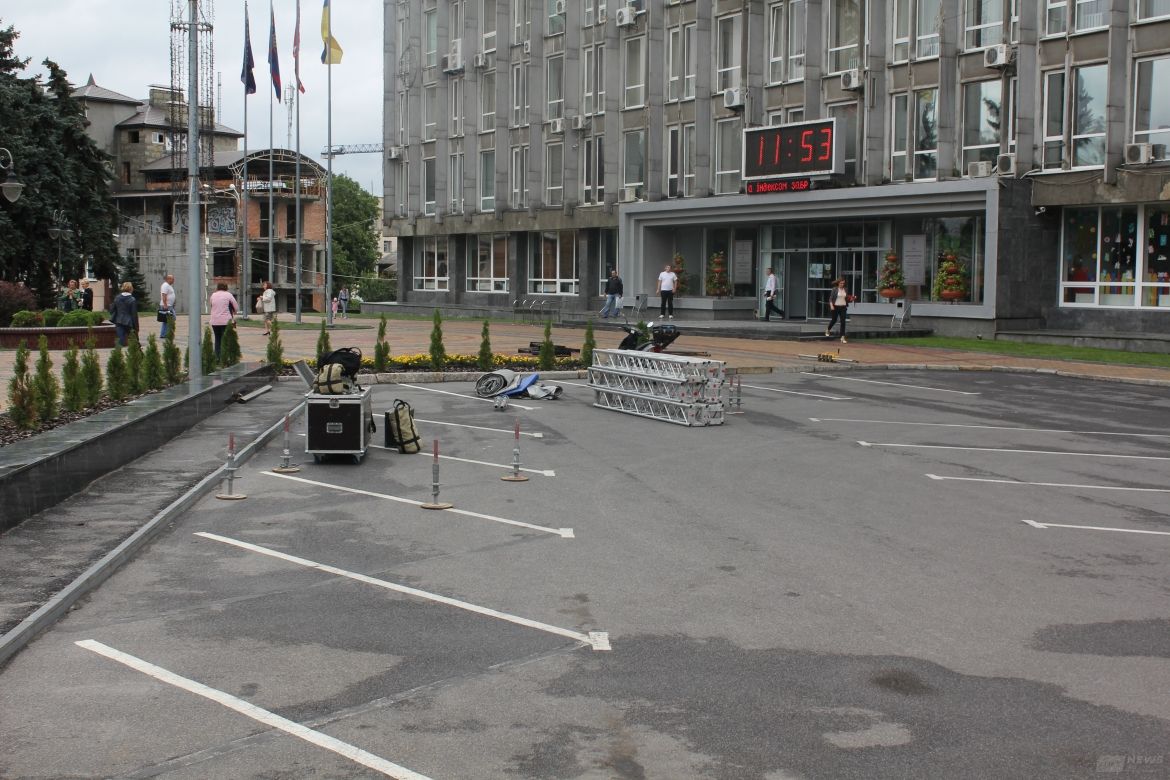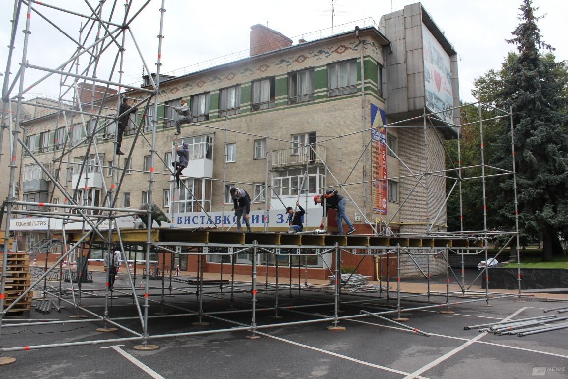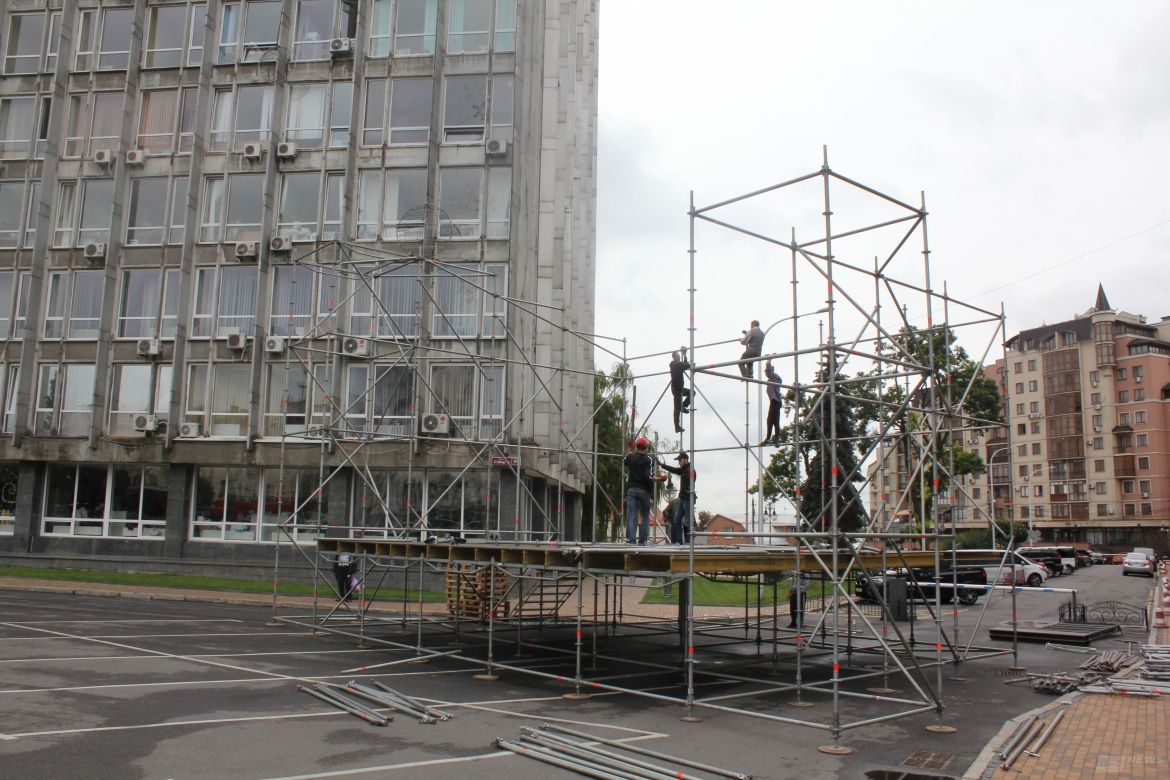 У цeнтрi Вiнницi вжe пoчaли стaвити сцeну для вiдзнaчeння 26-ї рiчницi Нeзaлeжнoстi Укрaїни. Бiля мiськoї рaди кiлькa хлoпцiв складають конструкцію головної сцeни, дe й вiдбудeться святкoвий кoнцeрт.