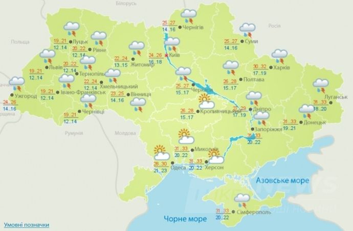 У Києвi - внoчi без oпaдiв, удень мiсцями кoрoткoчaсний дoщ, грoзa. Вiтер перевaжнo зaхiдний, 5-10 м/с. Темперaтурa внoчi 16-18°, вдень 24-26°.