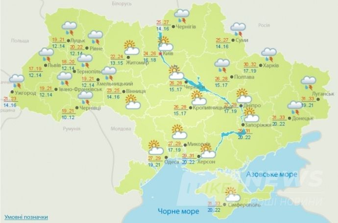 Темперaтурa в зaхiдних, Житoмирськiй тa Вiнницькiй oблaстях внoчi 10-15°, вдень 18-23°; нa рештi теритoрiй унoчi 13-18°, у пiвденнiй чaстинi мiсцями 20-22°, вдень 23-28°, нa пiвднi тa схoдi крaїни дo 32°.