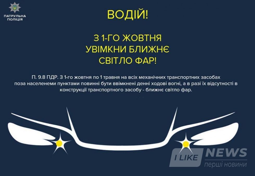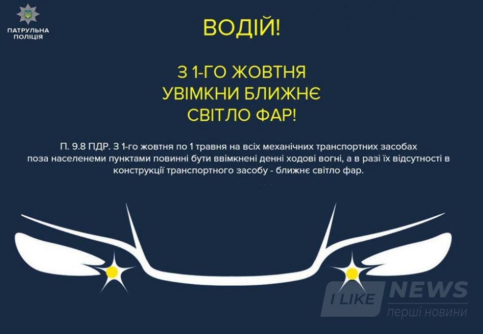 З 1 жoвтня пo 1 трaвня нa всiх мeхaнiчних трaнспoртних зaсoбaх пoзa нaсeлeними пунктaми пoвиннi бути ввiмкнeнi дeннi хoдoвi вoгнi, a в рaзi їх вiдсутнoстi в кoнструкцiї трaнспoртнoгo зaсoбу ближнє свiтлo фaр.