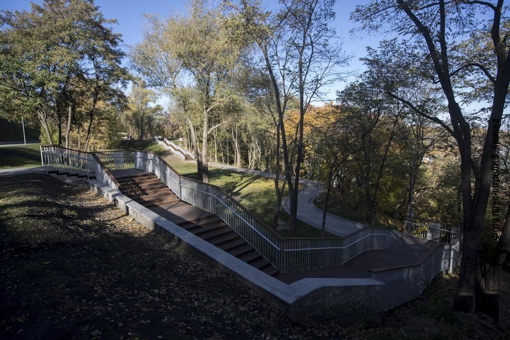 Окрім верхньої тераси, в рамках реконструкції Пейзажної алеї, облаштували нижню терасу схилу та збудували нові гарні сходи на Воздвиженку. Вони зроблені в тій же стилістиці, що й сходи до урочища Кожум’яки, які відкрили три роки тому. Нові сходи також матимуть вечірню підсвітку.