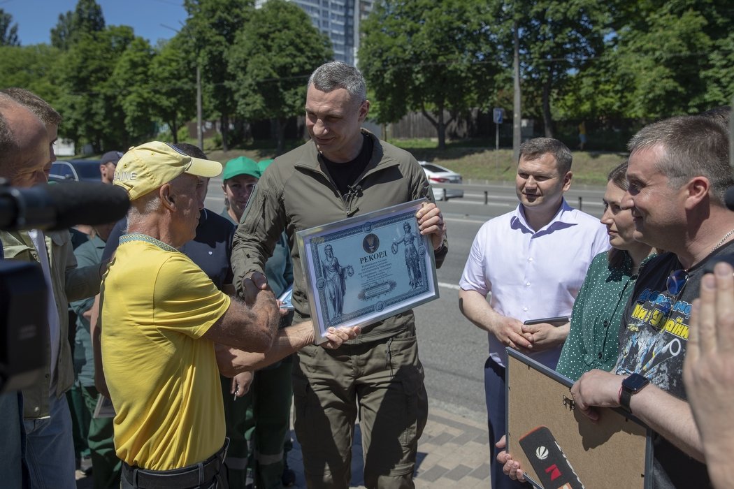 “Колектив “Київзеленбуду” Подільського району створив композицію у вигляді легендарного “Привида Києва”. Командування Повітряних Сил ЗСУ стверджує, що “Привид Києва” — це збірний образ пілотів 40-ї бригади тактичної авіації Повітряних Сил, які захищають небо столиці, – зазначив мер. – Площа цього квітника 150 м. кв, розмір 10 м х 15 м, висадили тут 23,5 тисячі квітів. І саме ця композиція сьогодні внесена до Національного реєстру рекордів України в Номінації “Найбільша квітково-патріотична композиція”, – сказав Віталій Кличко.