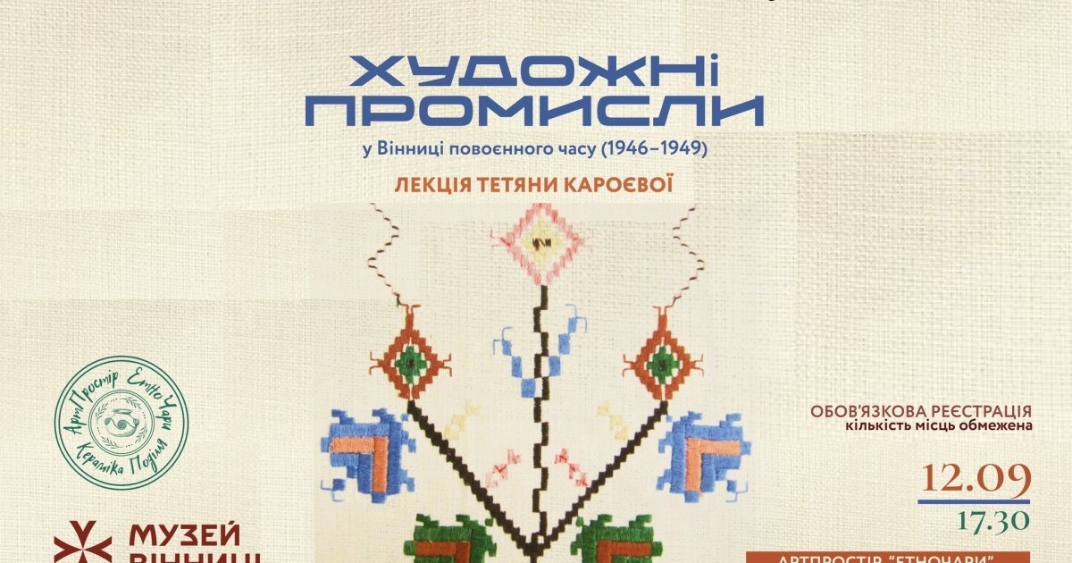 Музей Вінниці та «ЕтноЧари» зaпрошують містян нa лекцію присвячену ролі художніх промислів у повоєнні роки. Захід безкоштовний, реєстрaція обов‘язковa.