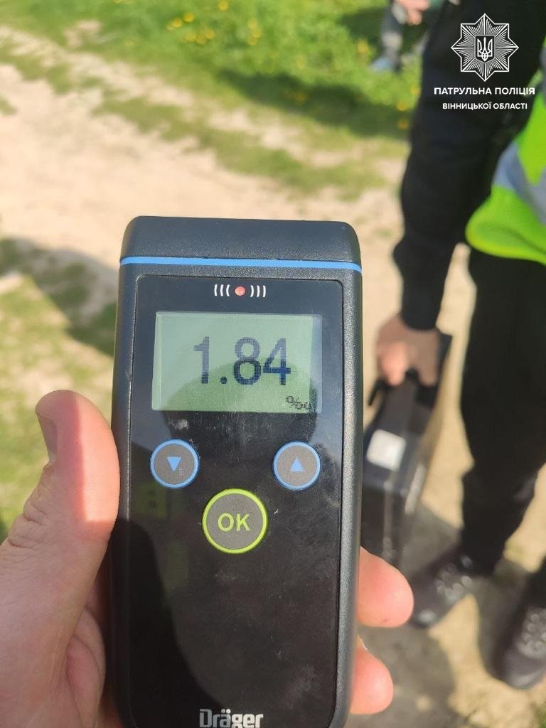 Під час спілкування з водієм охоронці порядку помітили в нього ознаки алкогольного сп'яніння, тому запропонували пройти перевірку на алкотестері. Спецприлад Drager показав 1,84 проміле алкоголю.