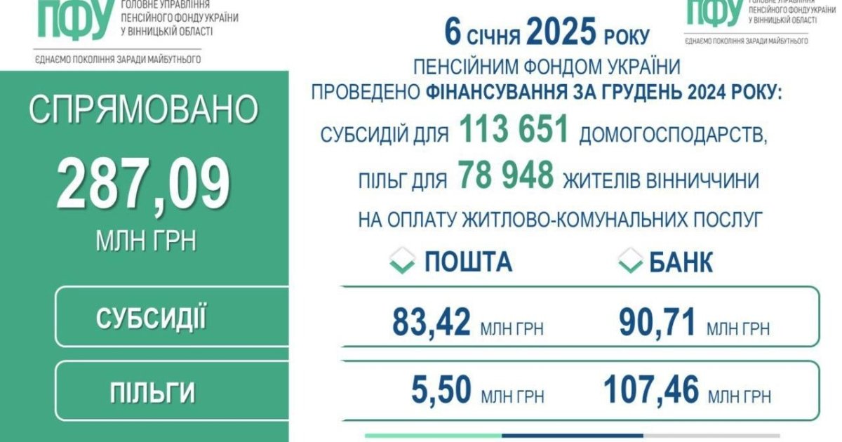 6 січня 2025 року Пенсійний фонд України профінансував виплати субсидій та пільг для жителів Вінницької області. Загальна сума фінансування склала 287,09 млн грн.
