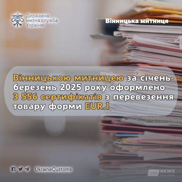 За січень-березень 2025 року Вінницька митниця оформила 3 556 сертифікатів EUR.1, що дають змогу українським товарам користуватись перевагами преференційної торгівлі при експорті до країн ЄС та інших держав-партнерів.
