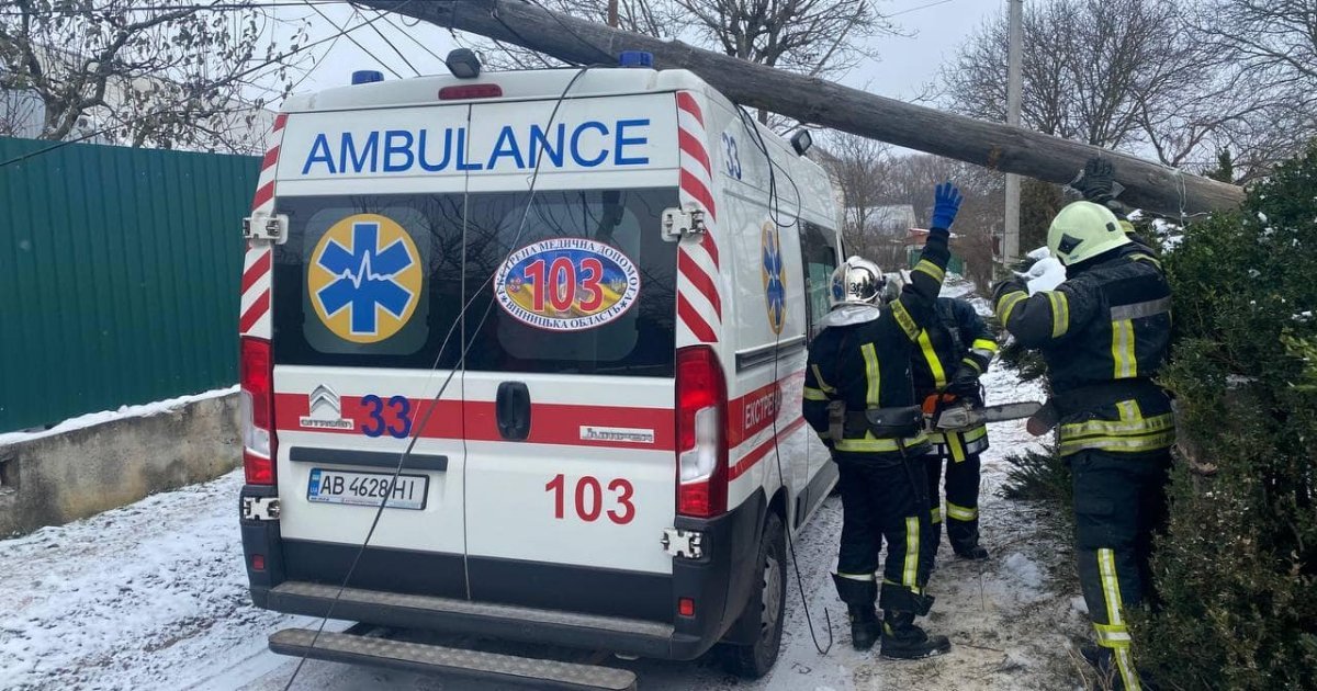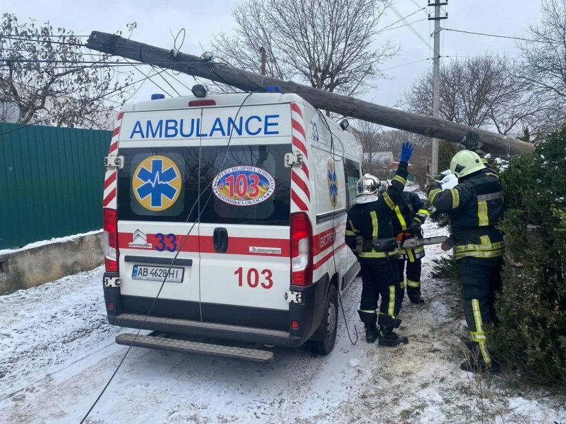 На Вінниччині дерев’яна електроопора впала на карту швидкої. Аби звільнити спец автомобіль медикам довелось викликати рятувальників. Про це повідомляє пресслужба ДСНС.