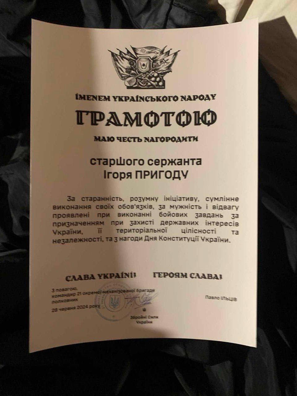 Бершадський міський голова Віталій Драган повідомив, що жителя їх громади, земляка - Пригоду Ігоря Володимировича нагороджено медаллю «За оборону України» та грамотою за старанність, розумну ініціативу, сумлінне виконання своїх обовʼязків, за мужність і відвагу проявлені при виконанні бойових завдань за призначенням при захисті державних інтересів України, її територіальної цілісності та незалежності, та з нагоди Дня Конституції України.
