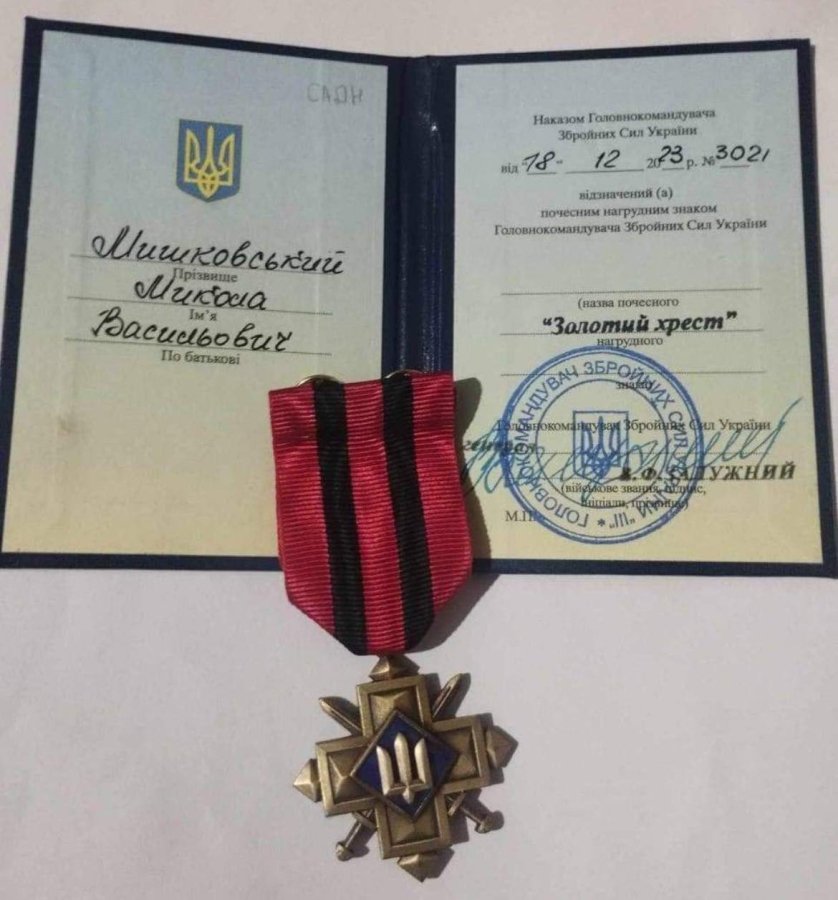 Цього рaзу Миколa Мишковський отримaв почесний нaгрудний знaк «Золотий Хрест». Чоловікa відзнaчили зa сумлінне виконaння обов'язку, мужність тa героїзм під чaс зaхисту Укрaїни від ворогa.