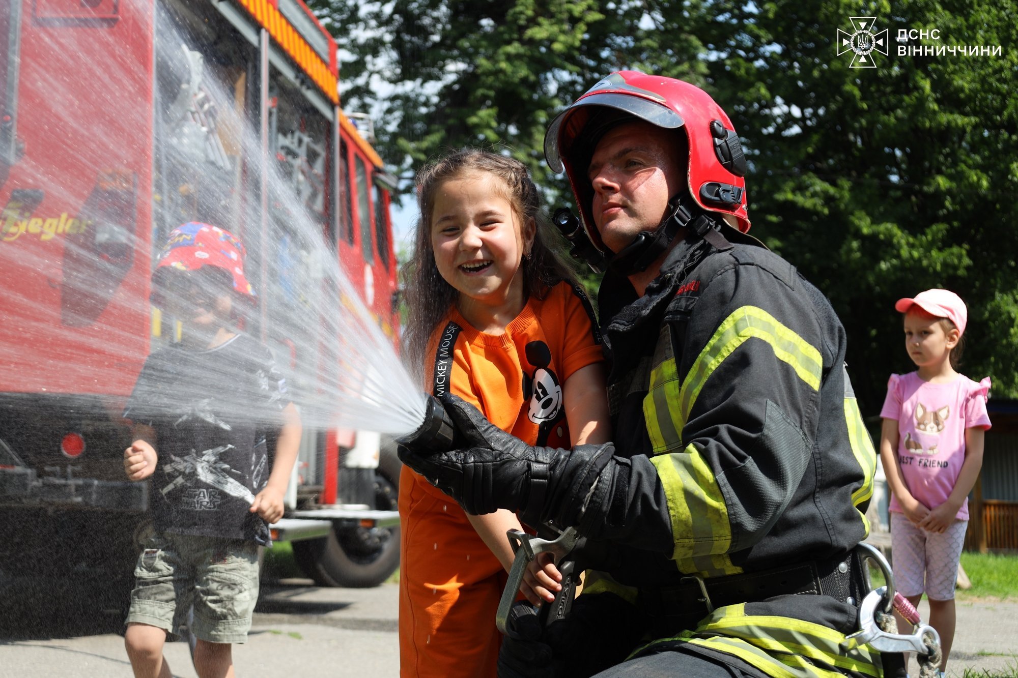 Малеча із задоволенням знайомилася з рятувальною технікою, приміряла спорядження, тримала в руках спеціальні інструменти, а також спробувала загасити умовну пожежу — як справжні вогнеборці.