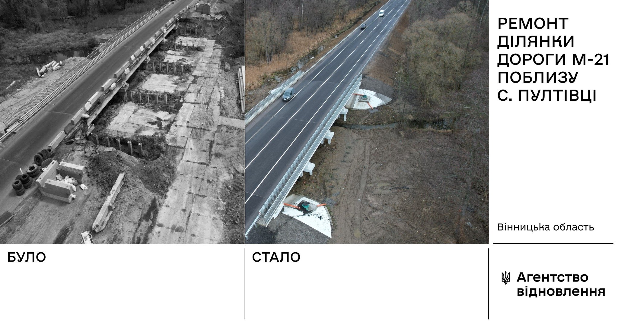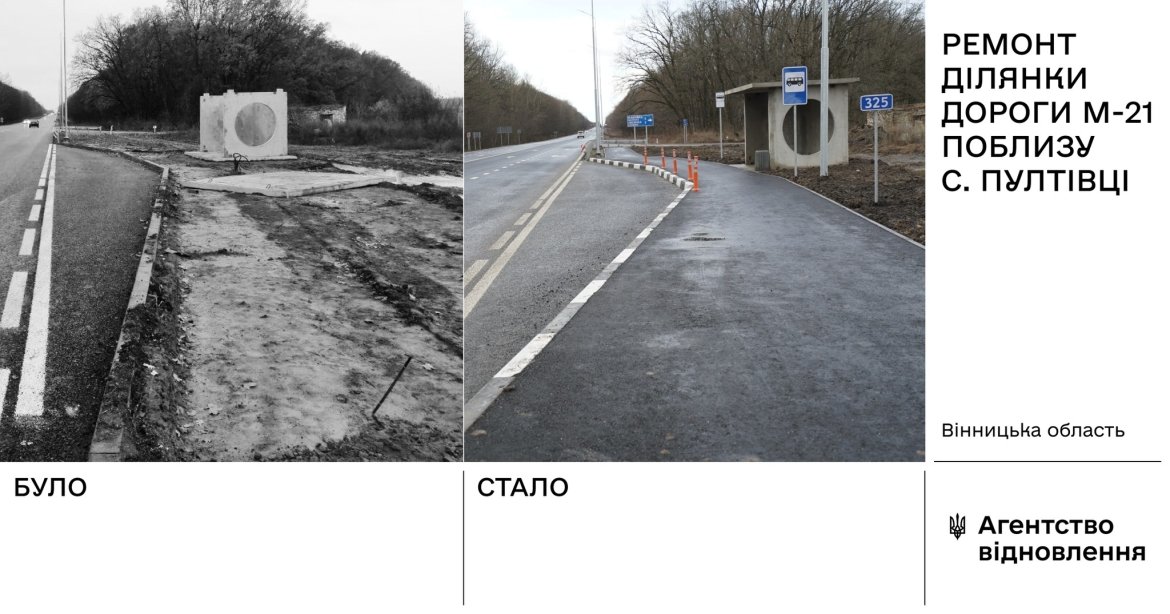 У межах капітального ремонту 4-кілометрової ділянки поблизу с. Пултівці у Вінницькій області будівельники влаштували верхній шар ЩМА, встановили 4 автопавільйони, облаштували 2 пішохідні освітлювальні переходи острівцями безпеки. Також у межах населеного пункту влаштовано 60 опор освітлення, тротуар з велодоріжками, бар’єрне огородження. Крім цього, відремонтовано міст довжиною 48 метрів.