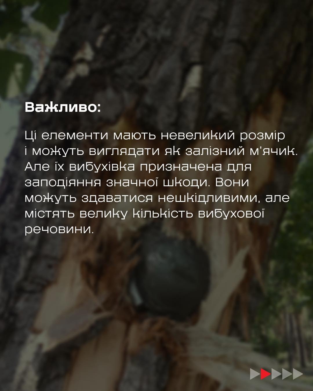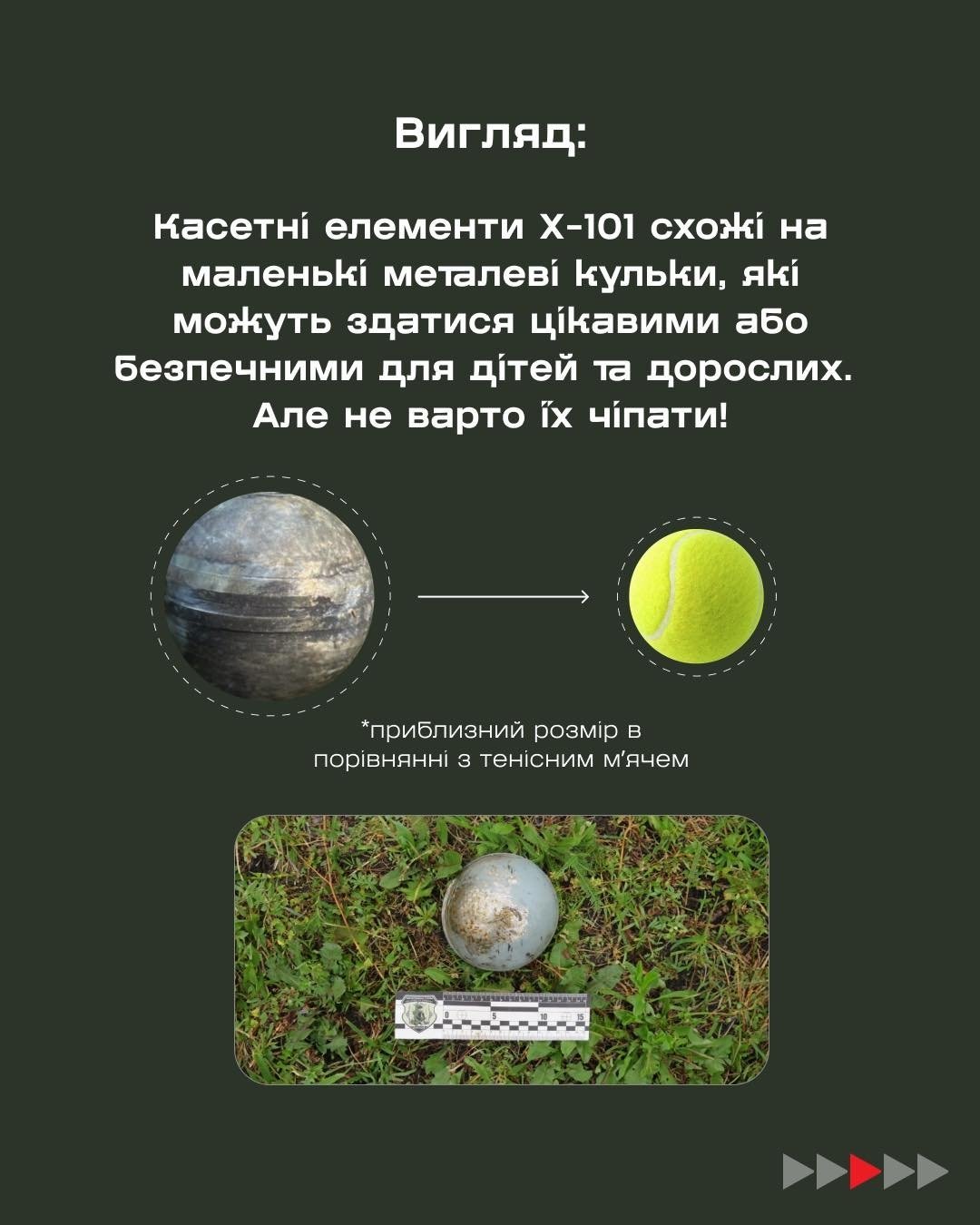 Рятувальники Вінниччині повідомляють про вибухонебезпечні предмети, які вже на сьогодні є загрозою для безпеки регіону. Це касетні елементи ракети Х-101. Вони виглядають як кульки, розмір яких трохи більше тенісного м‘яча. У разі небезпечної знахідки потрібно терміново телефонувати відповідну службу за номером 102. Жодних дій самостійно проводити не можна.