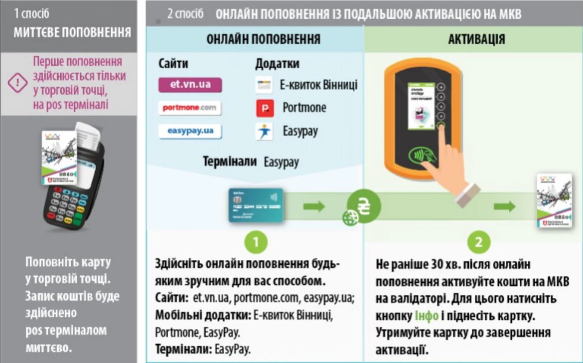 Через термінали здійснюється виключно поповнення гаманця, Онлайн-поповнення проїзних доступні лише на сайті. Як зазначають фахівці КП «Вінницький інформаційний центр», активацію краще здійснювати на наступний день після поповнення.