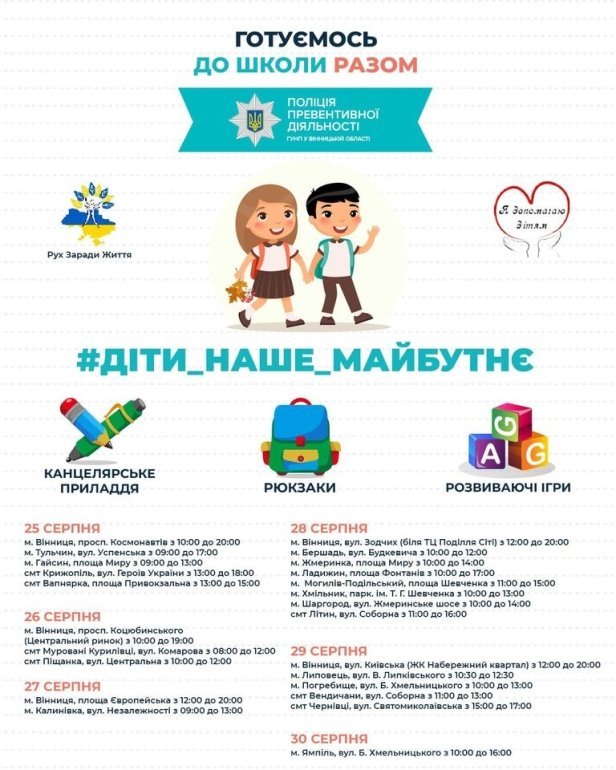 Поліція Вінниччині ініціює проведення благодійної акції «Готуємось до школи разом». Для того, щоб зібрати до школи дітей, які потребують допомоги громади поліцейські виставлять спеціальні контейнери у десятці міст та селищ Вінниччини. Також благодійники можуть звернутися до ювенальної поліції і надати адресну допомогу.