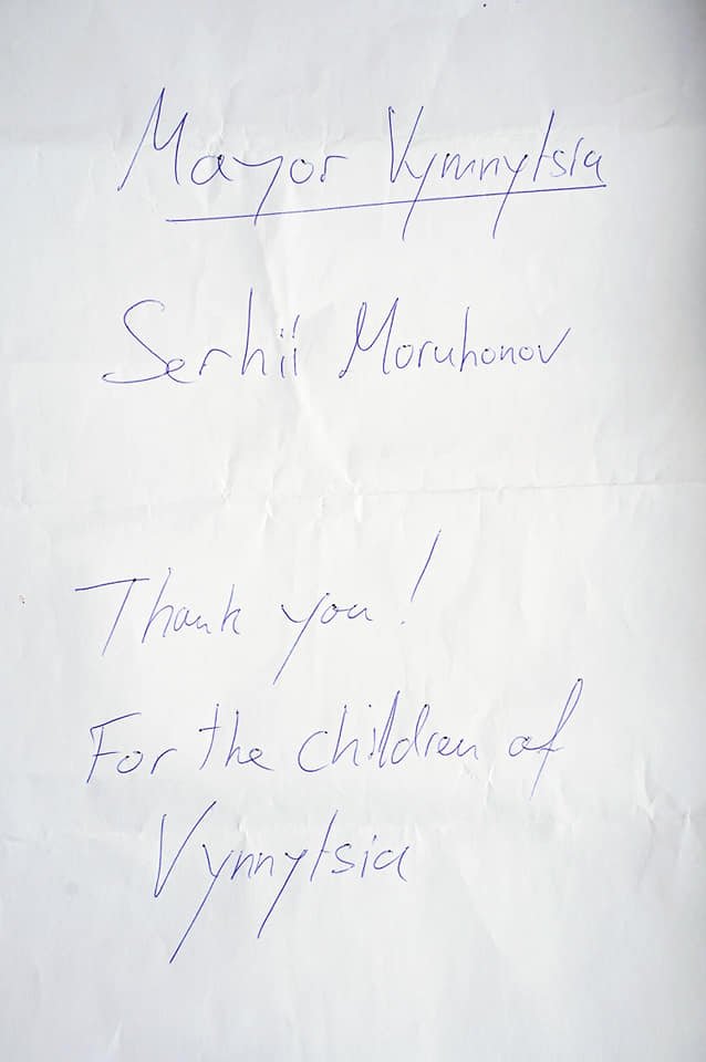 «Вінниця не забуде. Дякую, друже! – написав на своїй сторінці у фейсбук міський голова Вінниці Сергій Моргунов. Кошти направимо на закупівлю ліків та необхідних речей для дітей. Нам важлива підтримка. Світ має об'єднатися, щоб зупинити загарбницьку війну Росії проти України. А ми готові захищати кожен міліметр рідної землі».