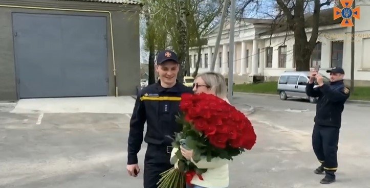 Своєю зворушливою промовою рятувальник розчулив серце не лише дівчини, а й усіх, хто спостерігав за новоспеченими нареченими. Тому, під спалахи проблискових маячків рятувальних авто він вручив коханій букет троянд та обручку і звісно, що у відповідь вона сказала «Так!».