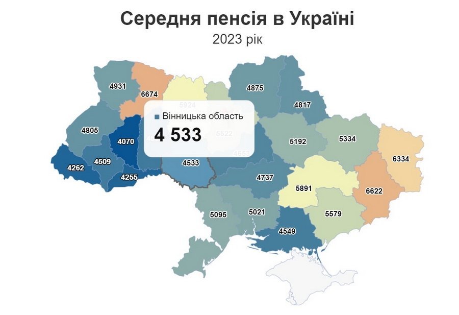 У Вінницькій області середня сума пенсії в 2023 році становила 4533 гривні.