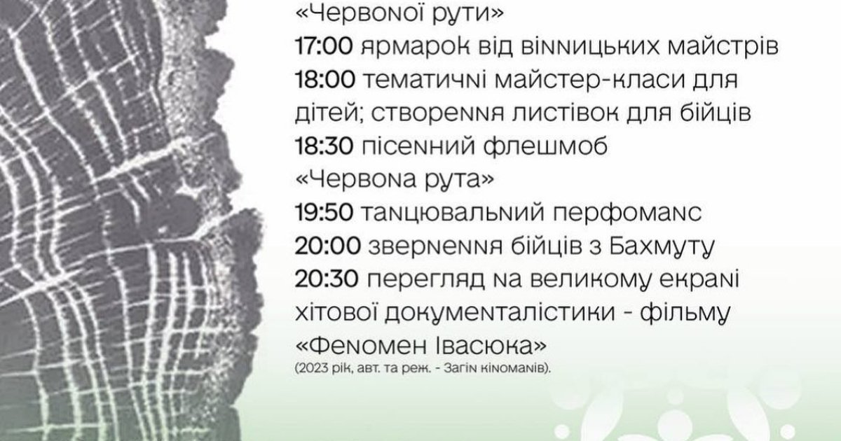 В рамках фестивалю вінничани матимуть змогу поласувати смаколиками, відвідати танцювальний майстер-клас, переглянути документальний фільм та придбати футболки, які прикрашає головний символ фестивалю – червона рута. Прибуток від продажів делікатес-маркету «Україночка» буде передано на збір для 93 окремої механізованої бригади.